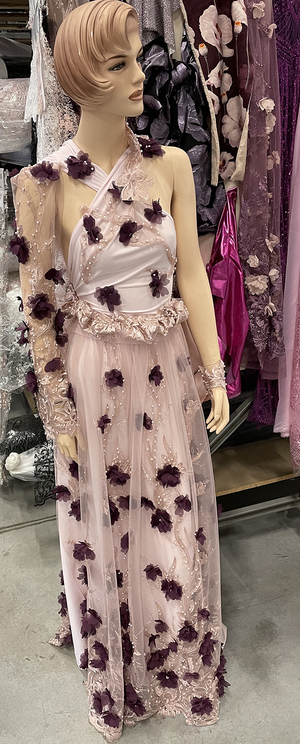 Dantela 3D cu flori din saten,margele si paiete, ideala pentru confectionarea unor rochii de seara deosebite.